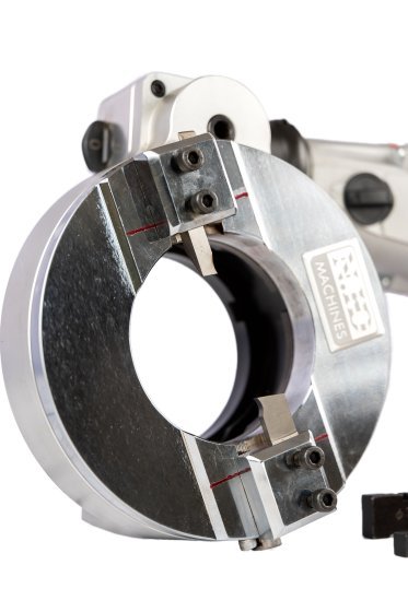 The Phyton 114ESC is an outside clamping machine with clamping by concentric, self-centering jaws, outside the tube. One half of the ring is fixedly clamped to the tube being machined, while the other, rotating half of the ring carries two tool-holders equipped with automatic feed. The automatic feed makes machining thick-walled tubes highly productive and comfortable.