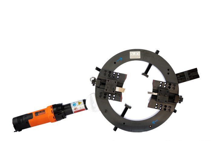 Phyton 325ES is the outside clamping machine. One half of the ring is clamped on the tube to be machined, while the other, rotating half of the ring carries two tool holders equipped with automatic feed. The automatic feed makes machining thick-walled tubes highly productive and comfortable.