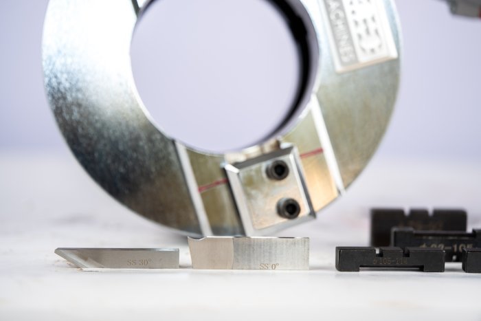 The Phyton 63ESC is an outside clamping machine with clamping by concentric, self-centering jaws, outside the tube. One half of the ring is fixedly clamped to the tube being machined, while the other, rotating half of the ring carries two tool-holders equipped with automatic feed. The automatic feed makes machining thick-walled tubes highly productive and comfortable.